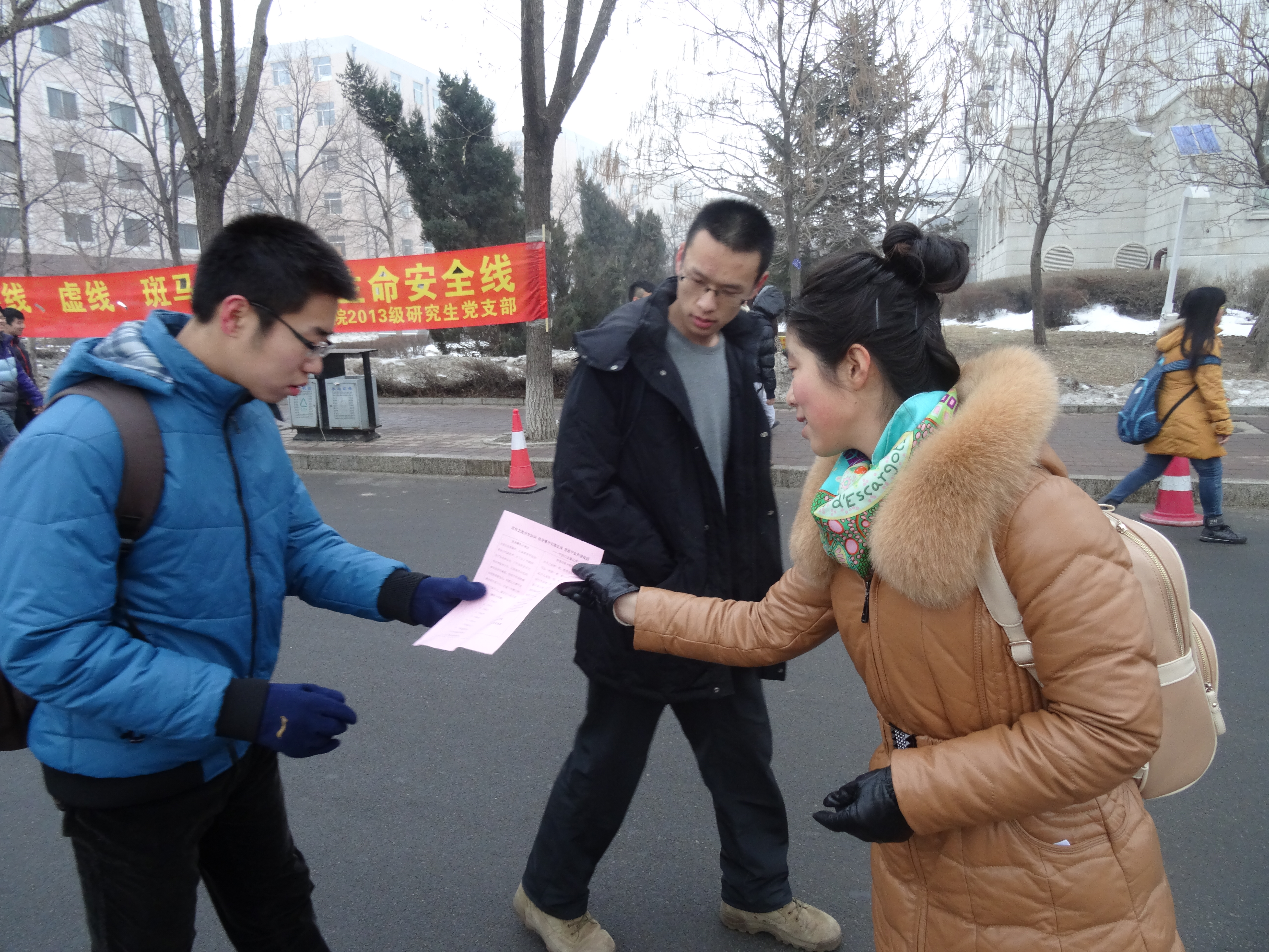 研究生党支部在开展党的群众路线教育实践活动以来,深入到基层,到广大同学中去,通过倾听、观察、交流和自身体会,发现在校园交通中,学生作为校园交通参与主体存在着如:1、不少同学缺乏交通安全知识2、部分同学作为机动车驾驶者法制观念淡薄,3个别同学安全意识差自我防范能力弱,4新生同学对东北冬季气候特点不熟悉,对交通情况估计不足等问题,使校园交通存在一定安全隐患,极速赛车