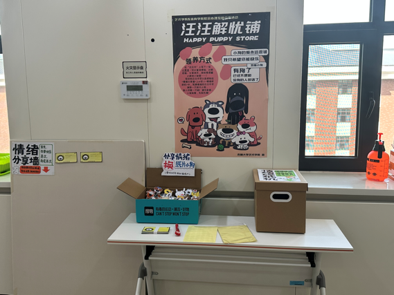 研究生合作,共同绘制、裁剪制作了许多可爱的纸片小狗,并精心设计了活动海报及宣传标语。5月6日上午7点30分:“汪汪解忧铺”正式开业!许多同学闻声前来,将自己亲手书写的情绪“汪汪币”张贴在情绪分享墙上或是将其投入在“情绪碎纸机”中,以换取领养专属可爱小狗的资格。在48小时的活动时间内,所有的小狗都有了自己的“新主人”!