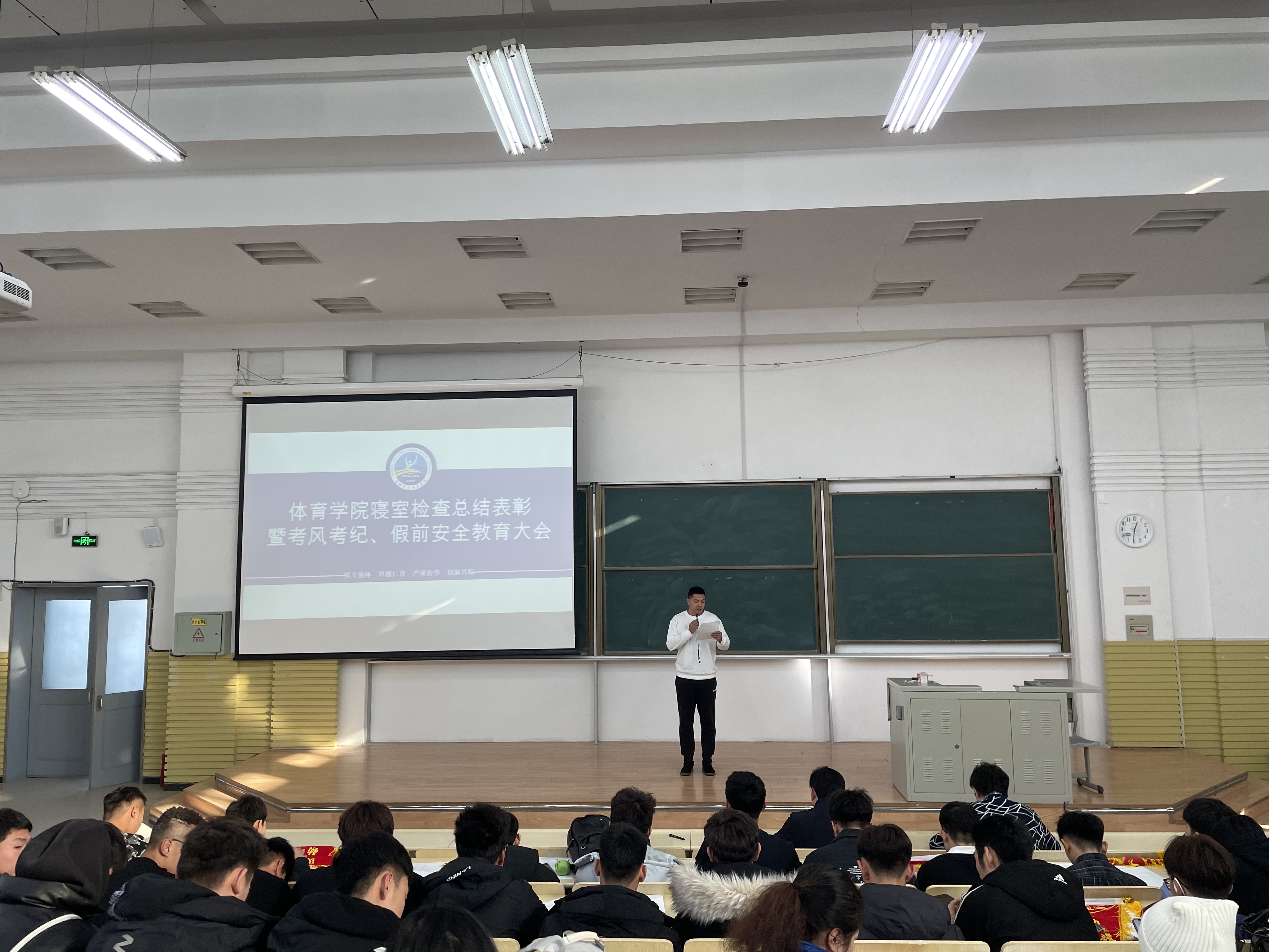 在逸夫楼第十阶梯教室召开本学期寝室检查总结表彰暨考风考纪、假前安全教育大会。极速赛车