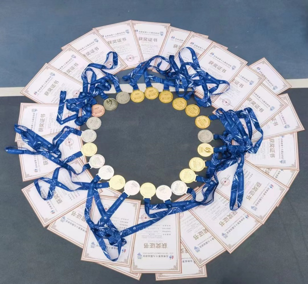 网球队在领队李廷奎、教练贾玥的带领下共获得4枚金牌,5枚银牌,1枚铜牌。其中,甲组(阳光组)获得男子团体银牌、女子团体银牌、男子单打季军、男子单打第四名、女子单打亚军、女子单打第六名,乙组(菁英组)获得男子团体金牌、女子团体金牌、男子单打冠、亚军,女子单打冠、亚军。