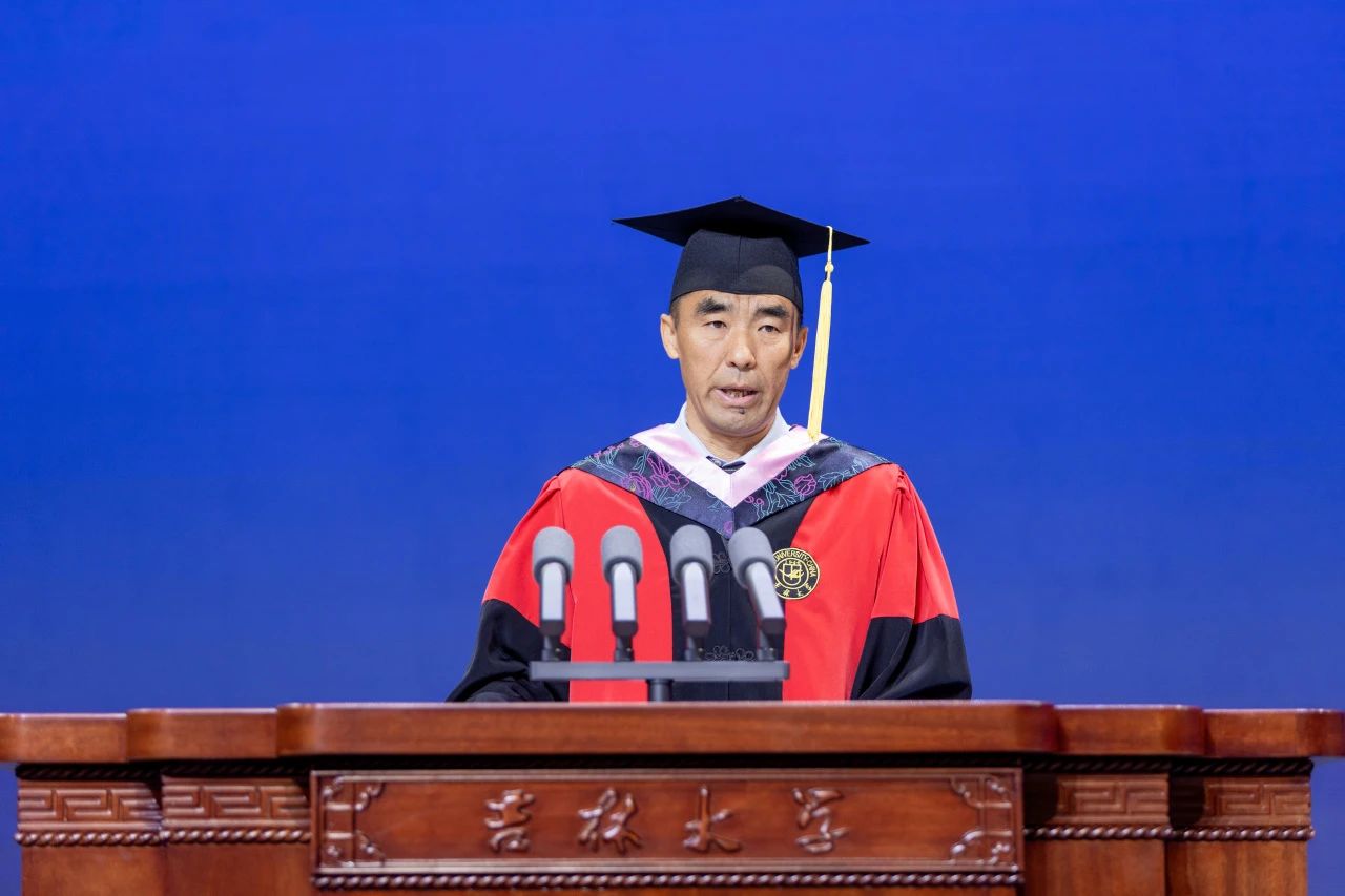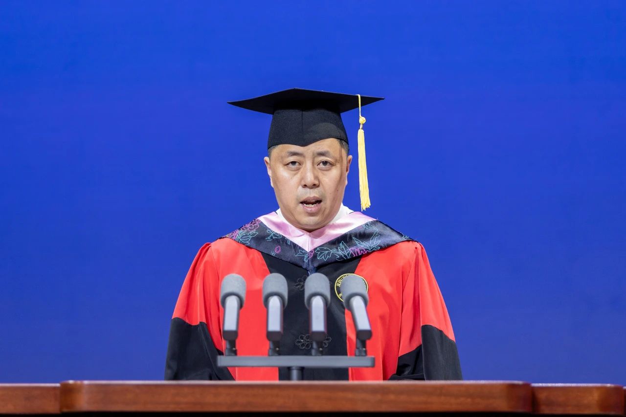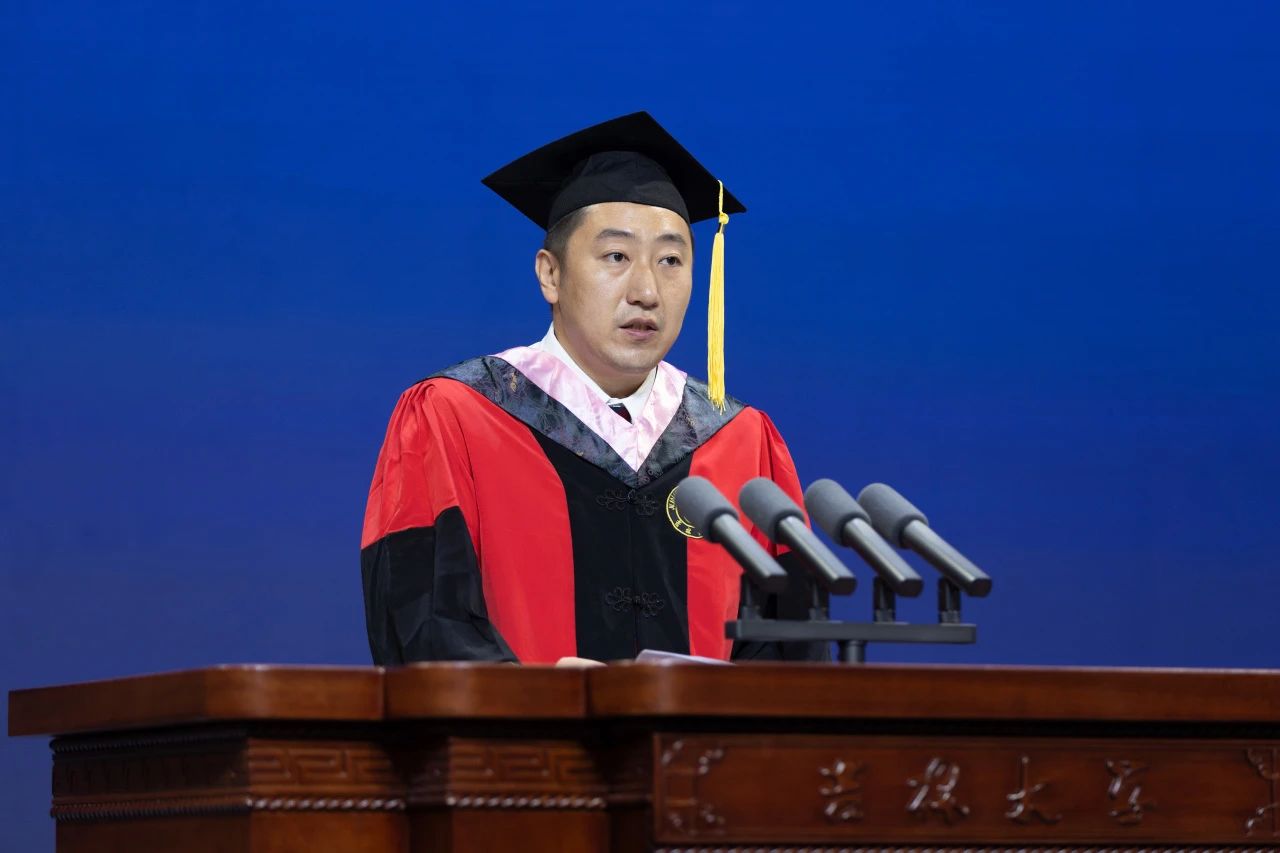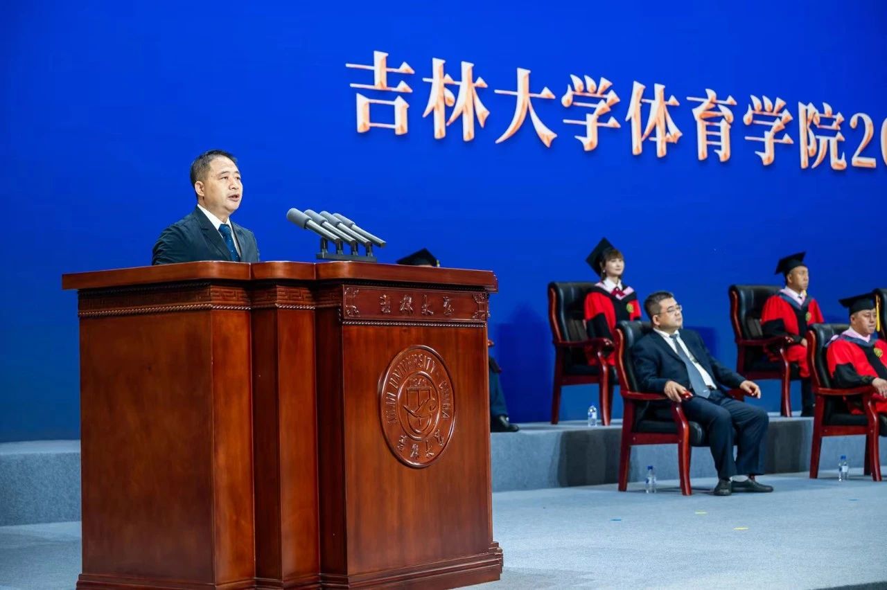 向全体毕业生表达了最热烈的祝贺,向全体教职工表达了真挚的感谢,向学生家长表达了崇高的敬意。接下来,他与毕业生分享体育的“自目的性”价值,“界限”价值,“自由”价值,“低效挑战”价值,“公平”价值,“不确定性”价值,“学习”价值,“卓越”价值,“共同体”价值,“美”的价值等“体育的十大内在价值”。他指出“体育的十大内在价值”是对体育的哲学思考,也是同学们未来人生道路上探索的方向,希望同学们能够从体育中汲取力量和智慧,在生活中实践这些宝贵的价值观,成就更加美好的人生。接下来,他用“奥运三问”的故事激励同学们,自觉肩负强国有我的历史使命,为全面建成社会主义现代化体育强国的宏伟目标努力奋斗。最后,他祝福毕业生“不以山海为远,初心如磐;不以风雨为惧,挺膺担当;不以日月为限,再谱华章。”