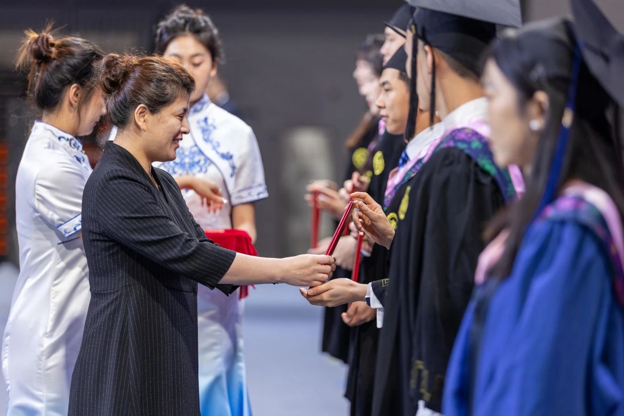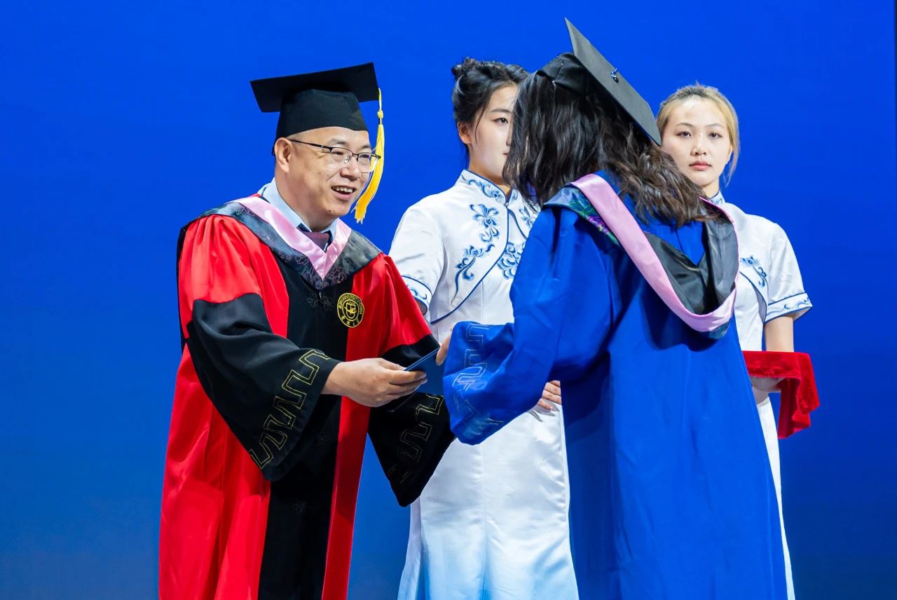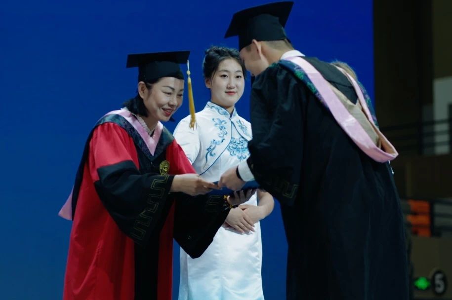 典礼伴随着奏唱国歌仪式拉开序幕。到场的师生们共同观看了毕业纪念视频,回忆起在校园的点滴和足迹。随后,王祥全副院长宣读了《关于授予2024届本科毕业生学士学位的决定》,授予马少敬等105名同学本科学士学位,李廷奎副院长宣读了《关于授予2024届毕业生硕士学位的决定》,授予毕文俊等23名同学研究生硕士学位。院长裘鹏为128名应届毕业生波动流苏,郭玉莲副院长和邹晓峰副院长分别为本科毕业生和硕士毕业生颁发学位证书。