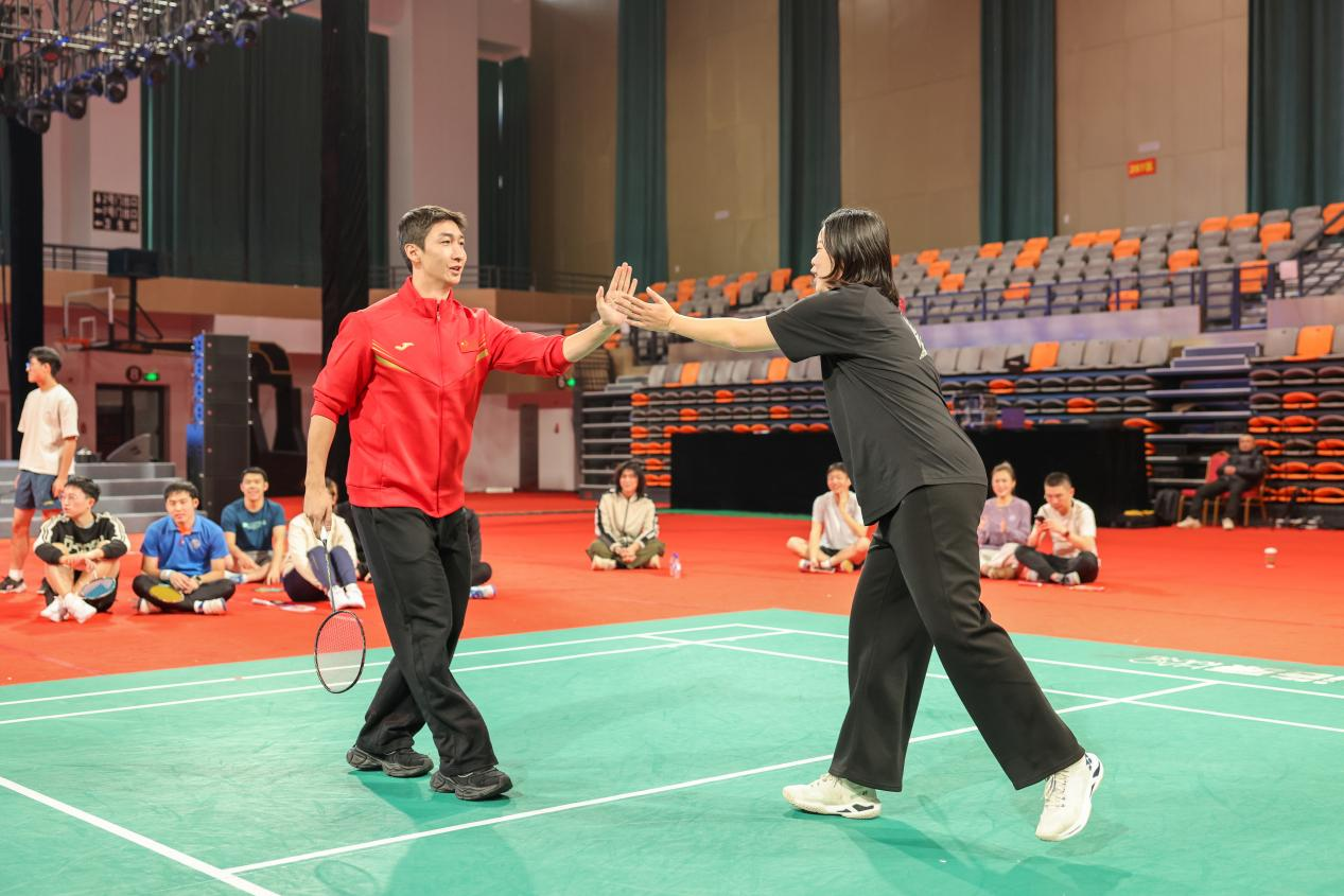 表演赛环节,助教老师采用“2人2球”趣味赛制为现场观众进行竞技展示。奥运冠军李雪芮、武大靖亲自上场,与学生进行交流赛,为现场观众呈现集专业性、观赏性与趣味性于一体的高水平表演,将现场气氛推向高潮。