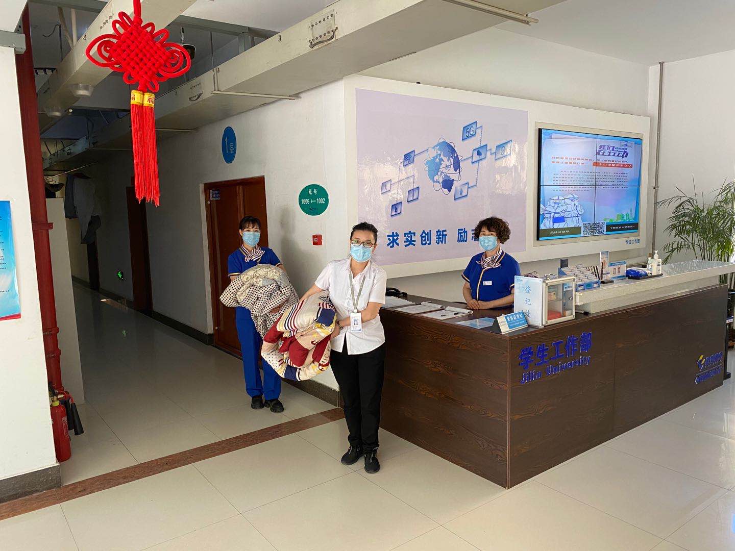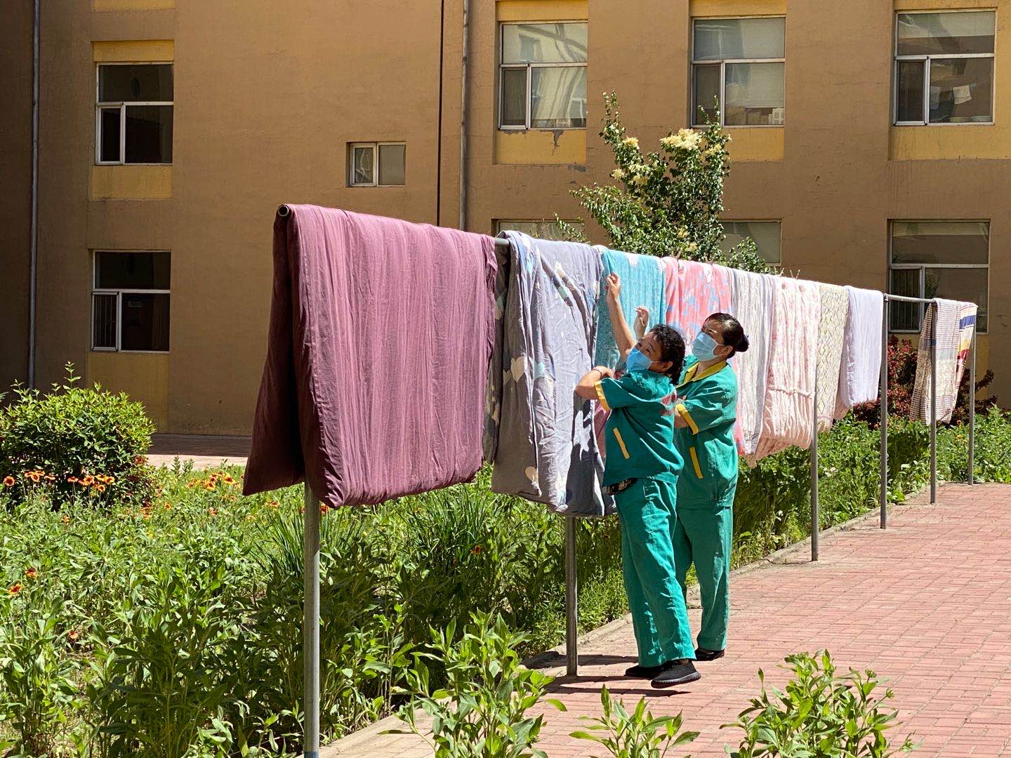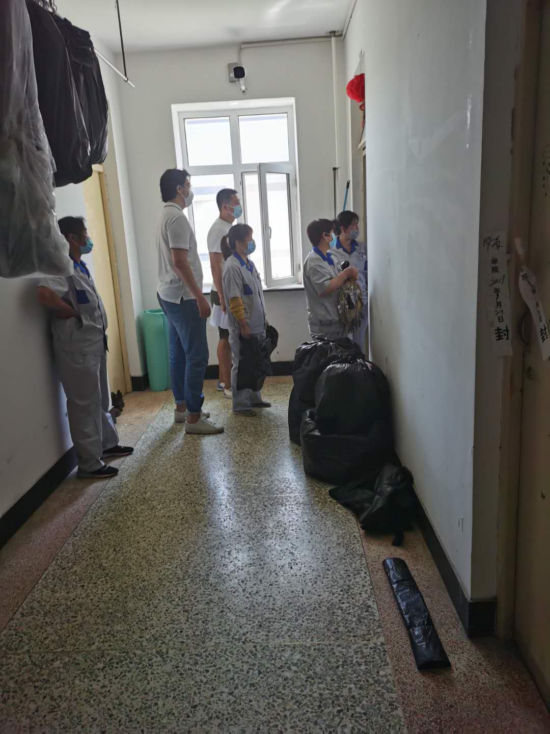 辅导员、前卫校区后勤服务中心公寓部工作人员、明德物业工作人员聚集在学生公寓门前,按照事先整理好的有诉求学生名单,逐一房间为学生晾晒被褥、清理垃圾。工作人员早已准备好名帖,分别在公寓床、被褥上做好标记,防止物品弄混、丢失。大家分工明确,擦栏杆、取被子、夹标签、晒被子、收回等一整套流程,全部由专人负责。最后,物归原位,叠得整整齐齐。