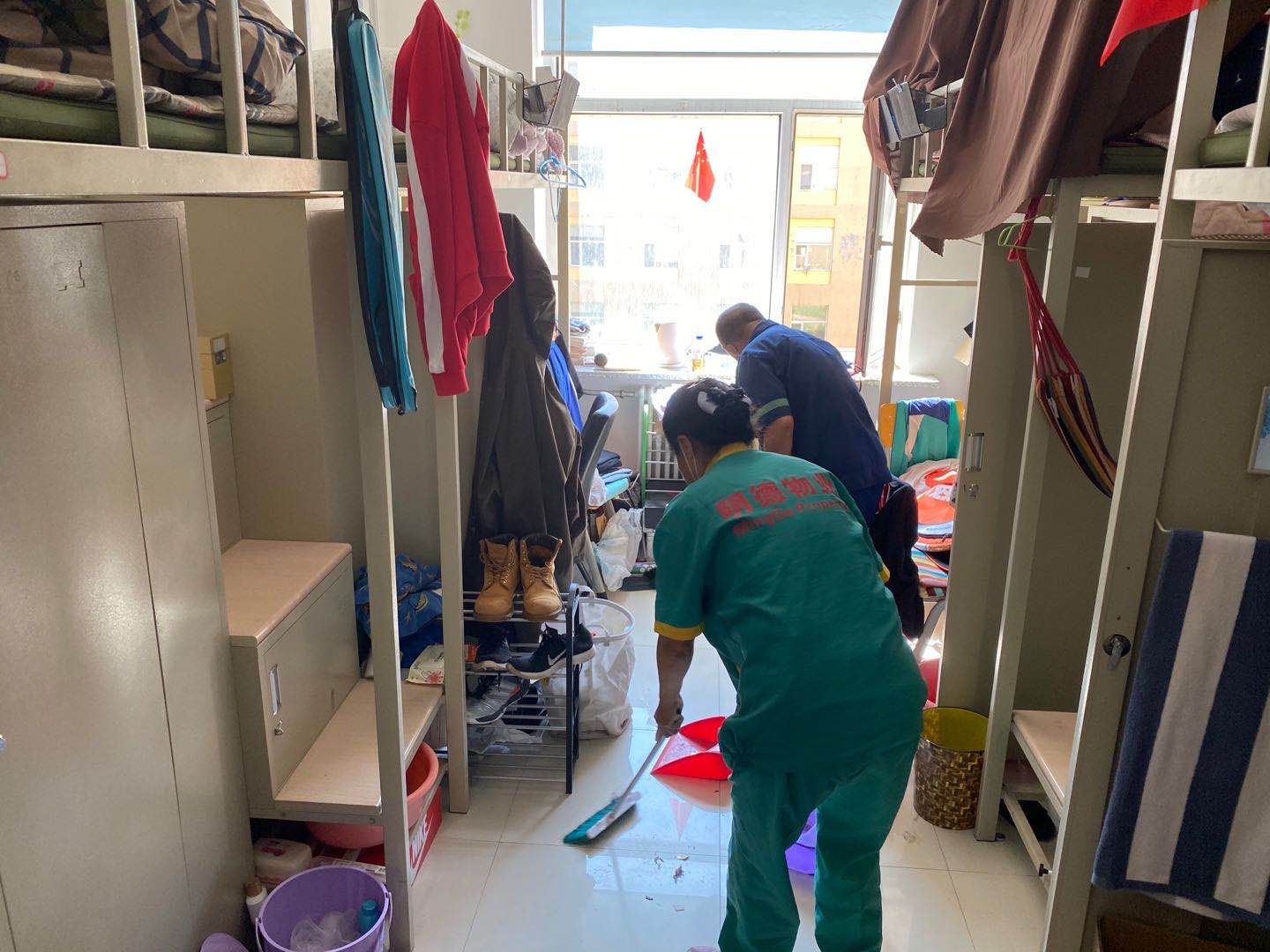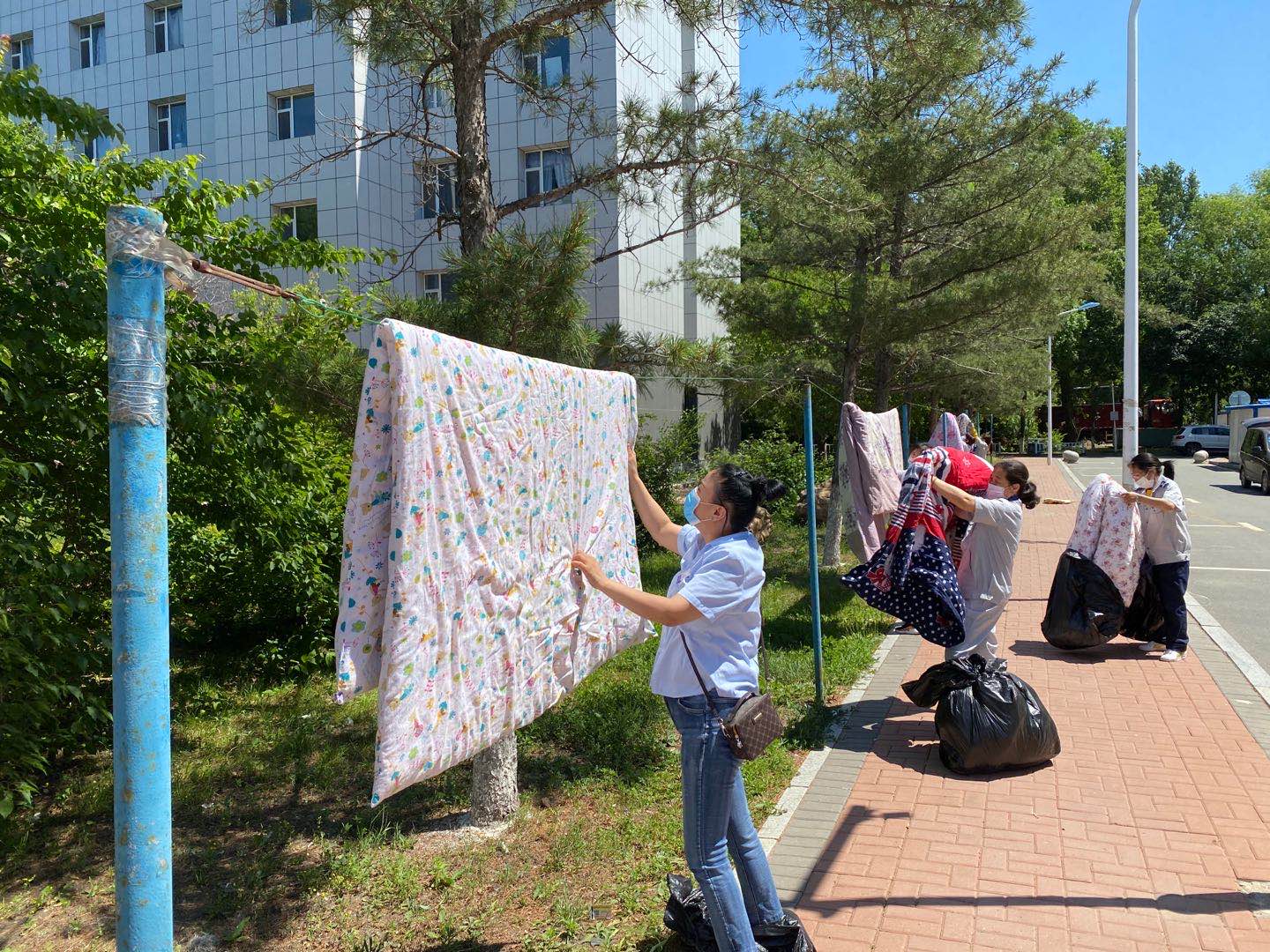 联合学生工作部、前卫校区后勤服务中心公寓部以及明德物业共同为毕业生晾晒被褥。