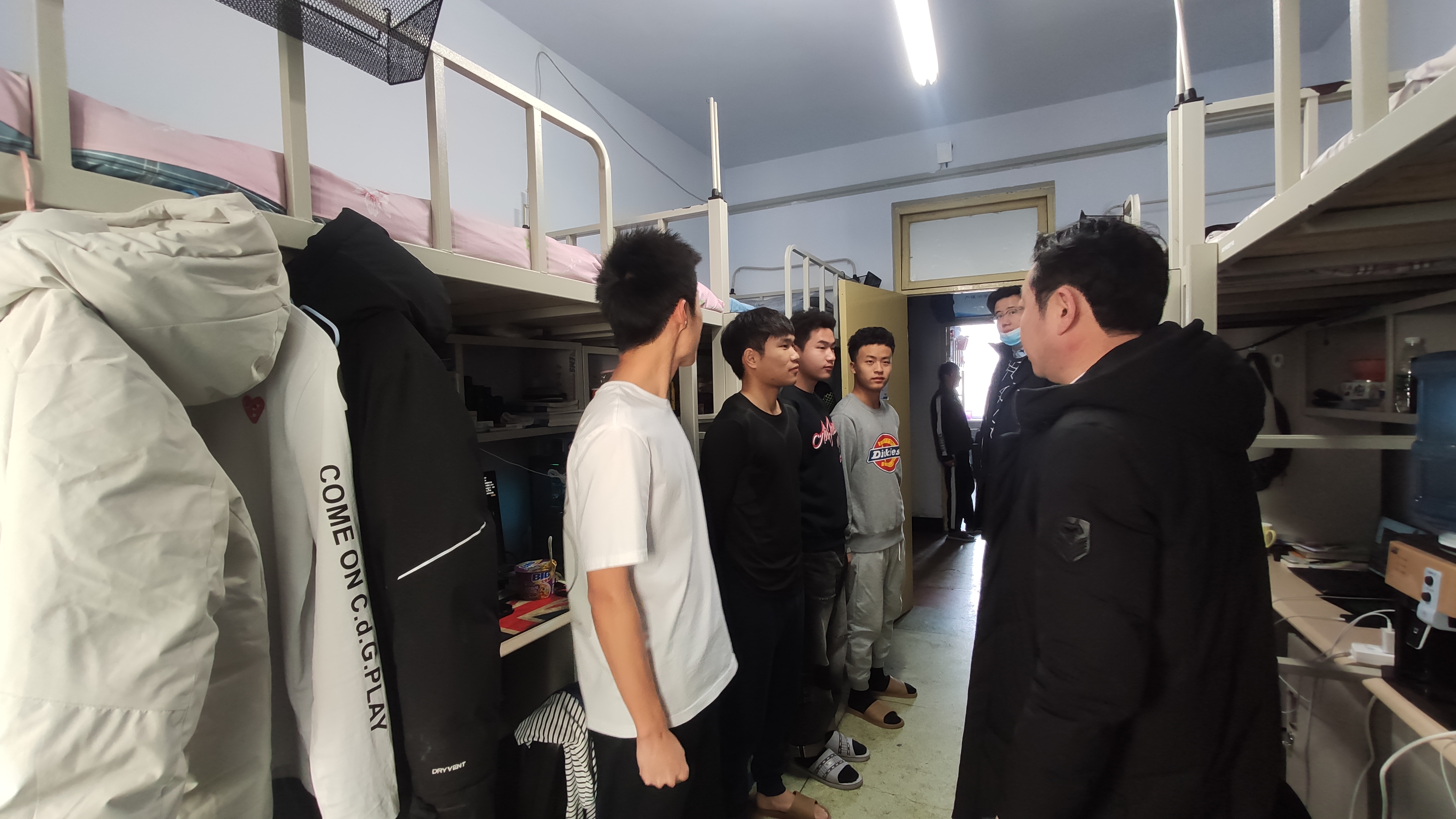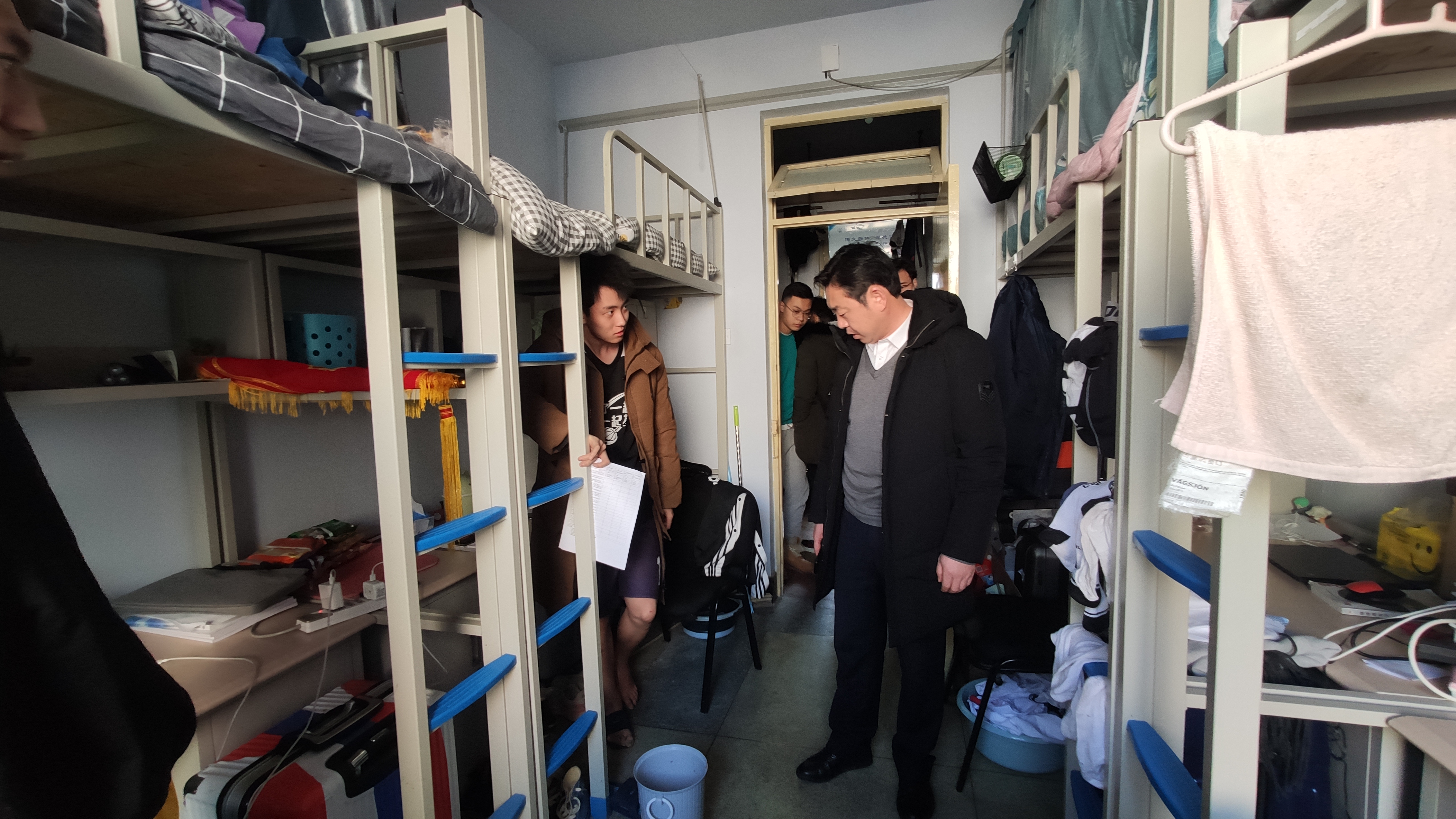 为进一步培养学生良好的生活习惯,排查寝室安全隐患,提高安全防范意识,2020年12月16日中午,极速赛车 党委副书记兼副院长田进和全体辅导员带领极速赛车 生活管理委员会学生干部,对极速赛车 本科生寝室进行了走访和安全卫生大