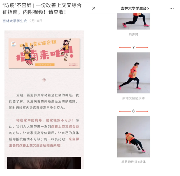 学生会骨干张熙策、姜熙宁、赵偲艺等向大家普及运动常识和各种健身动作,并组建了健身打卡群,居家期间为同学们答疑解惑,分享经验。