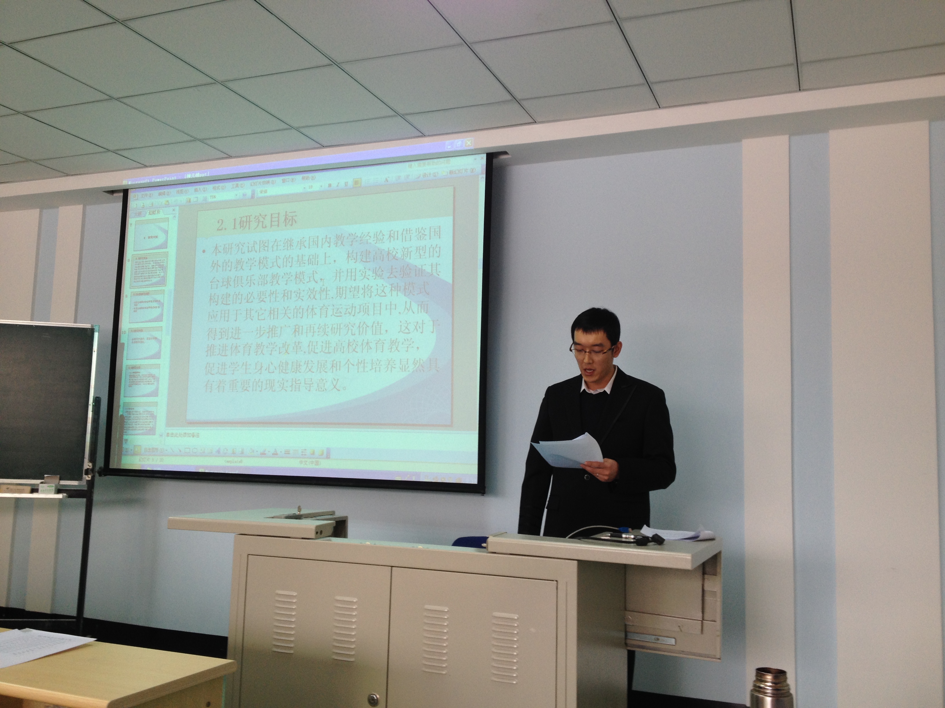 学术型硕士研究生论开题在体育馆多媒体教室准时开始,整场答辩会秩序井然。评委杨杰老师、周游老师、张晓义老师、郭玉莲老师、刘英伟老师、张婷老师、迟化老师、刁振东老师、刘巍老师全程指导,董德鹏同学做记录。