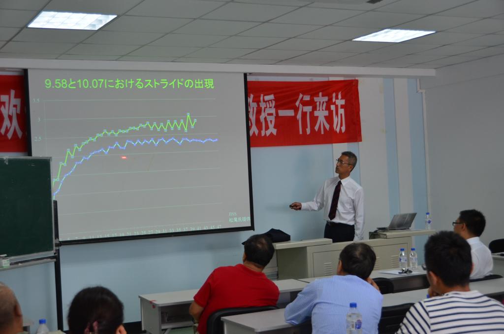 At 13:30, Professor Shigeo delivered a lecture to teachers of specialized courses and some undergraduate and graduate students of the Physical Education College in the multimedia classroom and track-and-field corridor, titled “Running Guidance—Cited Views in the University Environment”. In his lecture, Professor Shigeo provided a theoretical and practical explanation on the senses, independence, environment, and strength of running, fromwhichboth the faculty and student have benefited a lot.